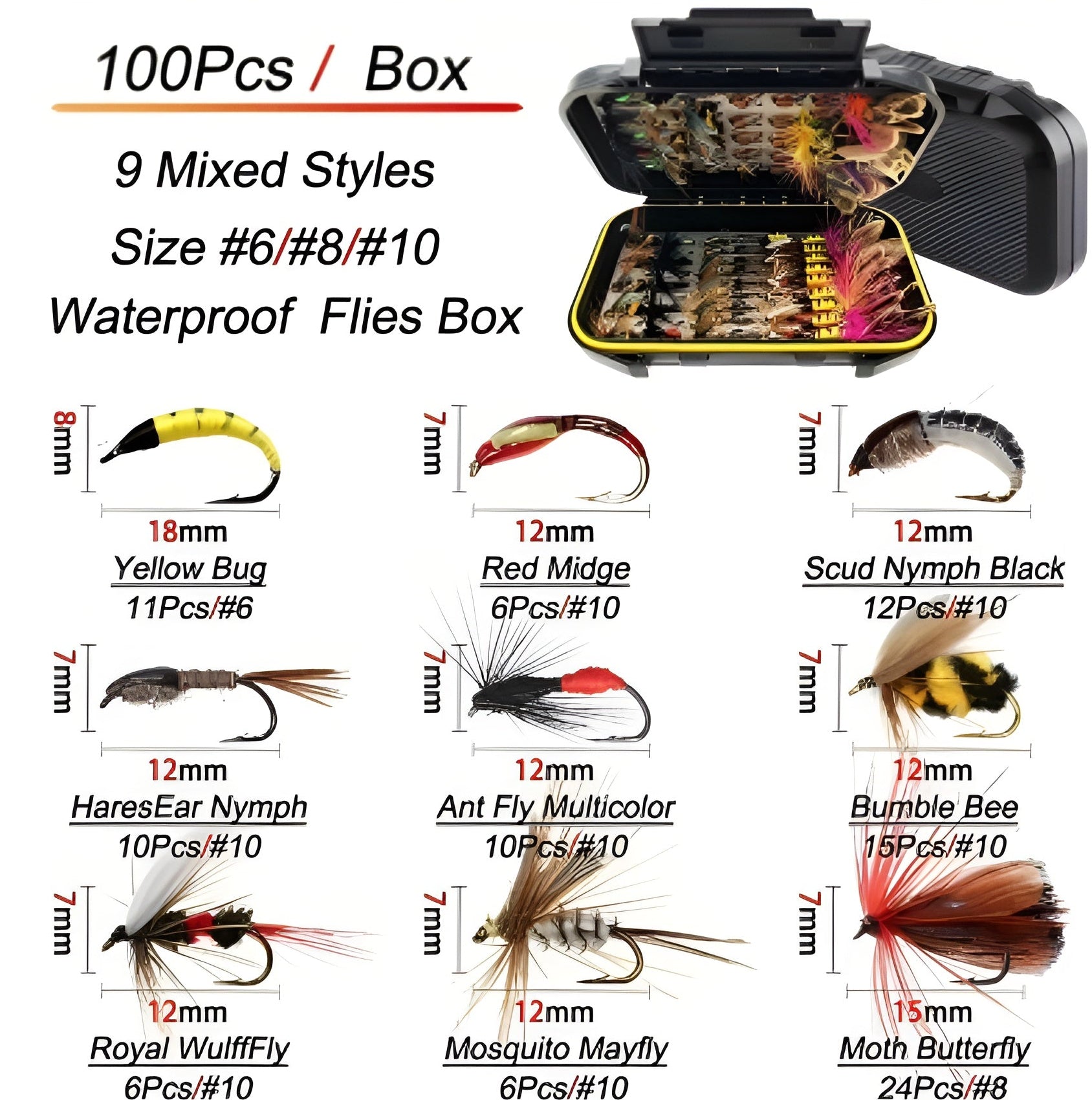 A total ofĀ 100 premium-quality fliesĀ acrossĀ 9 mixed styles, all hand-tied using durable hooks and high-grade feathers, threads, and materials. Each pattern is crafted to mimic natural insects and attract fish in all water conditions.